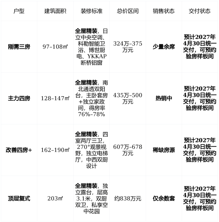 在售状态主力户型97–203㎡,总价324万–838万,全系精装交付,余量约124套,无摇号、不限购,2027年4月30日统一交付