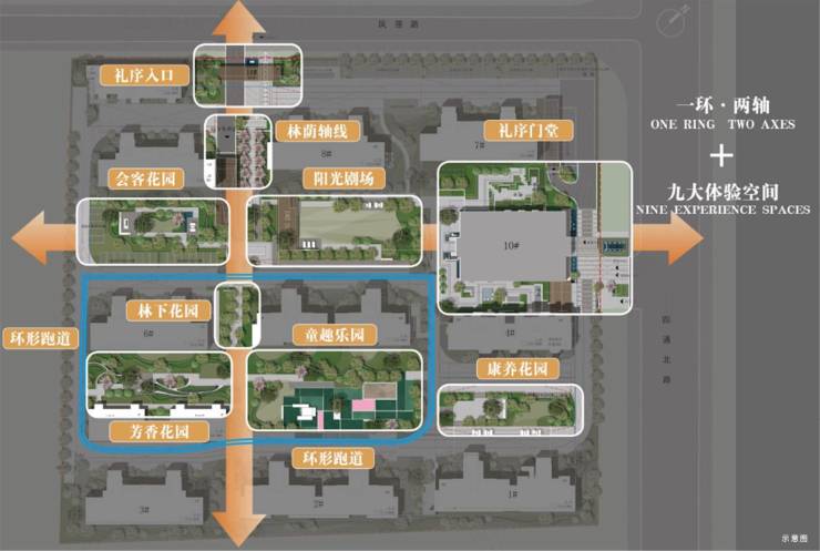 社区设计:采用“一环两轴九大空间”布局,配备星空夜跑道、童趣乐园、林下会客区等全龄化设施