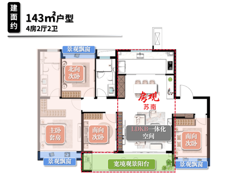 户型设计:主力户型为建面约128㎡与143㎡的四房两厅两卫,功能性强,空间通透,主打“大面宽、短进深、南北通透、主卧套房”等设计,满足改善家庭居住需求 。