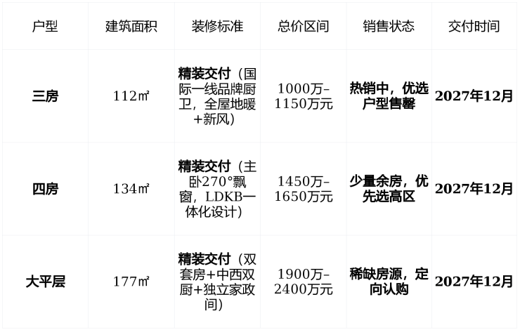 在售状态主力户型112㎡三房、134㎡四房、177㎡大平层,均价11.1–11.9万元/㎡,总价1000万–2400万元,剩余房源有限,预约制看房