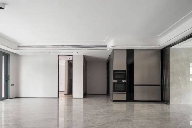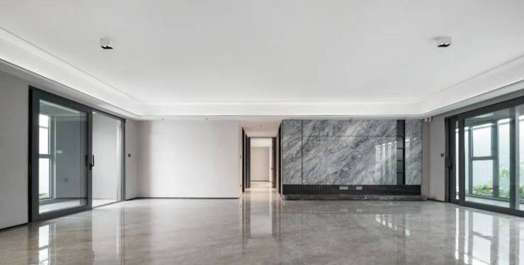 更多人第一眼就被震撼到的,一定是它的客厅,面宽堪比电影院的宽大银幕,且将高端岩板材质的背景墙拉通至阳台,全部融为一体。