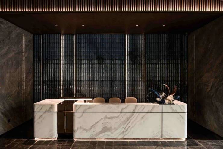 接待台的背景屏风则映有云纹图案,既精巧细致,又展现了精湛工艺。