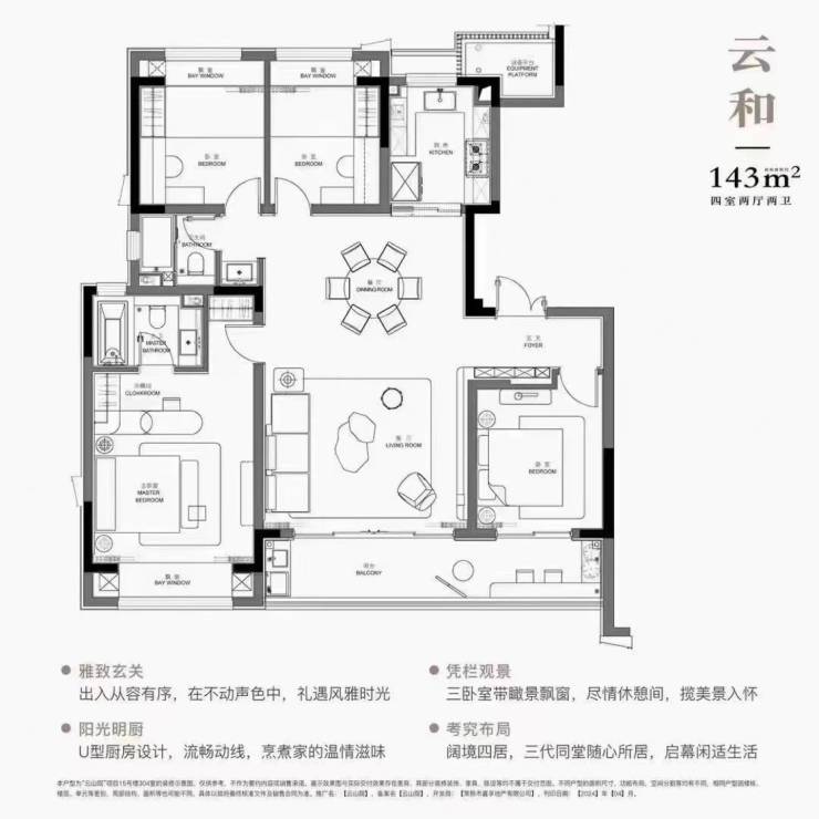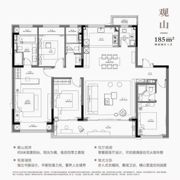 户型:主力户型为建面约143㎡(4房2卫)、185㎡(4房3卫)、225㎡(4房3卫),精装交付