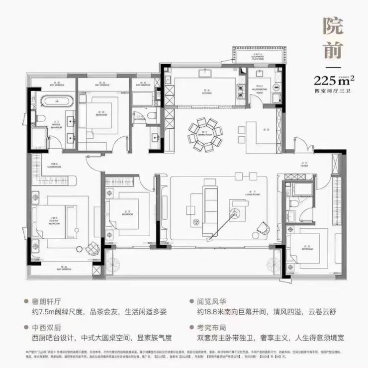 225㎡户型亮点:客厅面宽达到约7.5米,连通约18.8米的南向双联阳台,中西双厨设计,双套房布局
