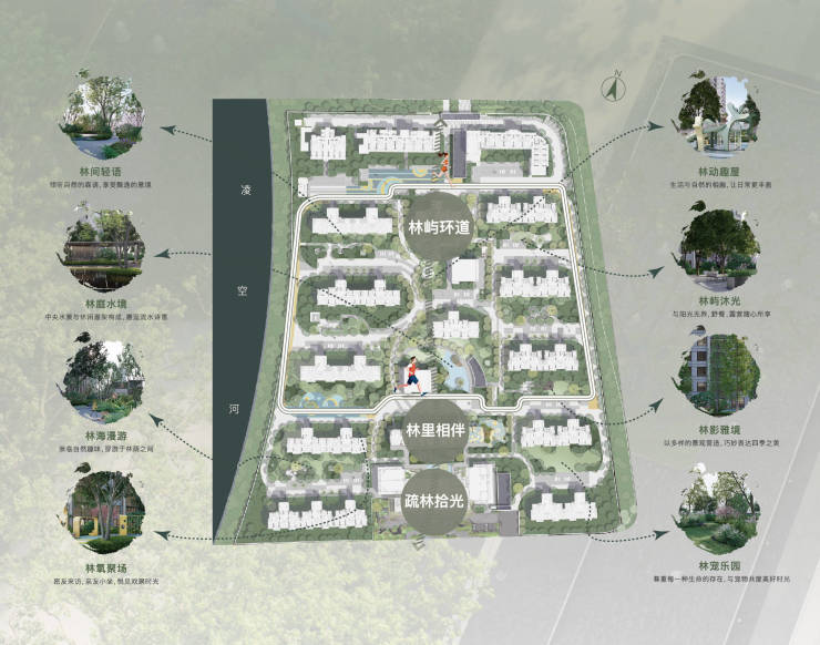 景观体系:打造"一轴三园"景观布局,150米礼仪中轴串联中央景观带,包含儿童活动乐园、老年康体花园与环形夜光跑道