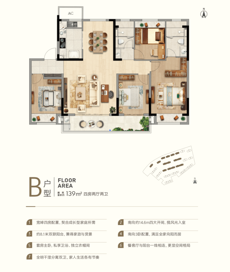 主力户型:125㎡(四居室)、139㎡(四居室)、165㎡(四居室),得房率约85%