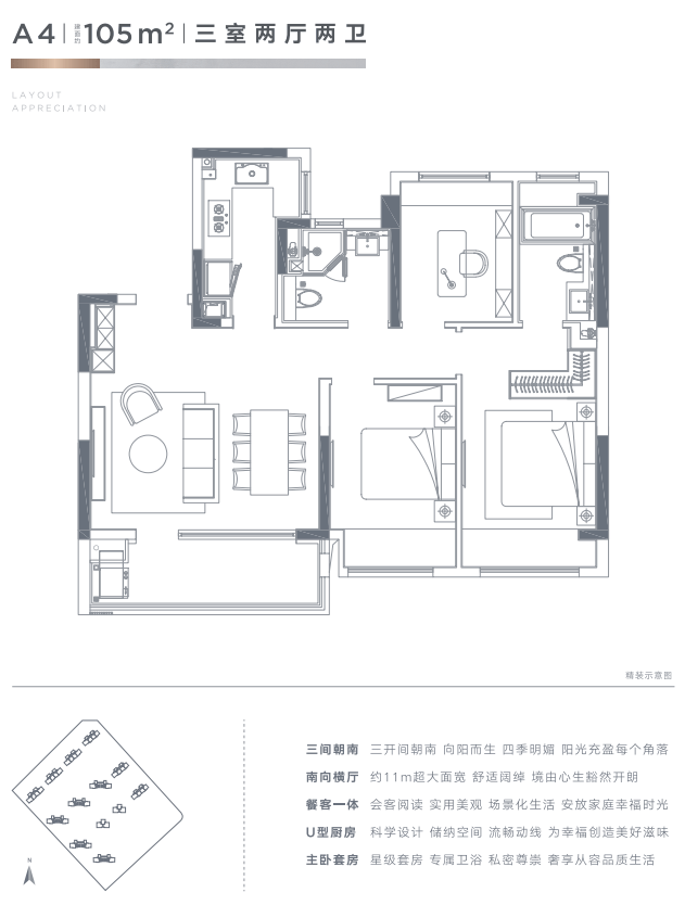105㎡:三房两厅两卫,南北通透,动静分区。
