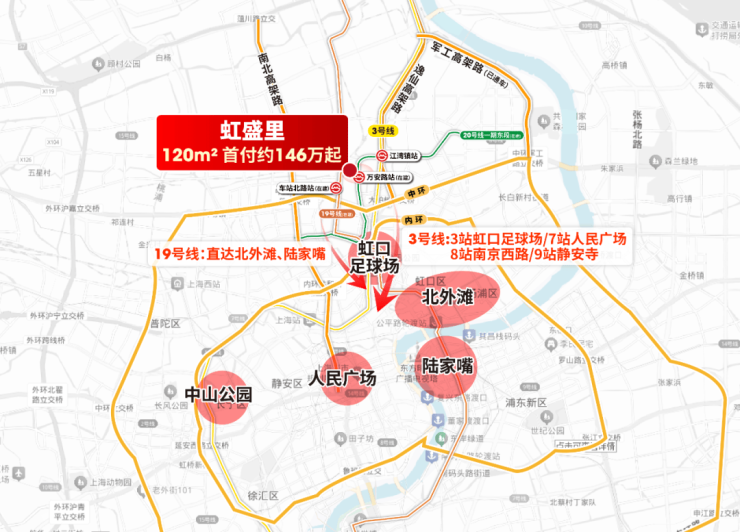 三轨交环绕形成高效通勤网——直线距离3号线江湾镇站约500米,3站虹口足球场/7站人民广场/8站南京西路/9站静安寺;直线距离20号线万安路站约150米(在建)/直线距离南北大动脉19号线车站南路站约900米(在建),未来可直达北外滩、陆家嘴。