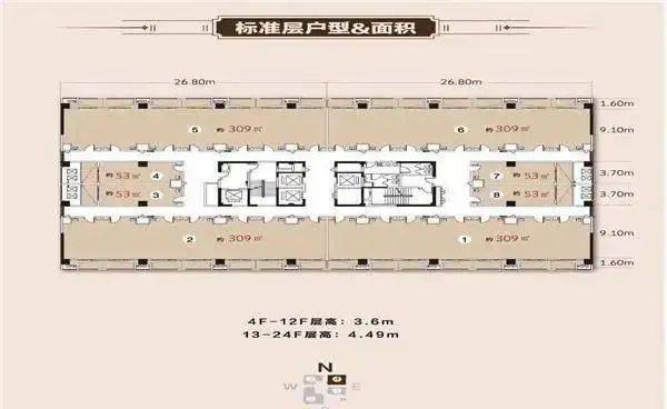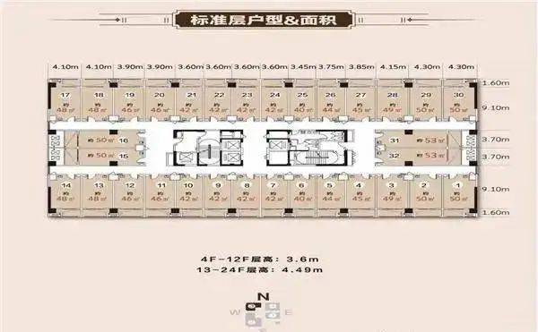 3号楼创客空间 4-12层净高3.6米 13-24层4.49米挑高;建筑面积40-53㎡;总价53-90万均价1.4-1.7万