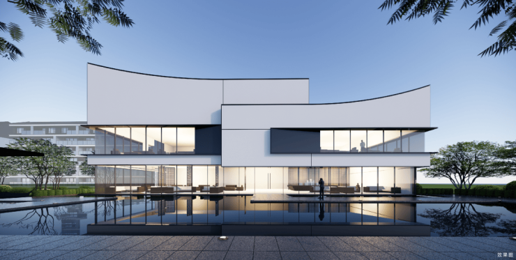 公建化美学立面,黑白灰基调,大面积蓝灰色玻璃,宽大玻璃窗使建筑视觉感更加轻盈。宽幕窗景,IMAX观景阳台,采光与视野皆满足,在家中坐享山湖景色。