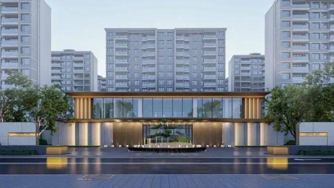 项目定位为"离产业更近、 与自然相融"的大零号生活芯湾未来主义墅区,建筑采用新亚洲风格坡顶设计,立面选用葡萄牙米黄石+香槟金铝板,细节处体现匠心工艺。