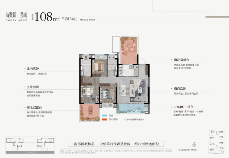 主力在售户型为建筑面积约95-111㎡的三房两厅两卫,能很好地适应市场主流家庭结构的需求。在户型设计上颇具巧思,采用奇偶层错位布局:奇数层设南向或270°转角庭院,偶数层实现南北双庭院,结合6米挑高与隐私挡板,打造出“层层有花园”的立体生态体验,让高层住户也能拥有独立的私人绿化空间,满足了喜爱园艺、追求自然生活方式家庭的需求。