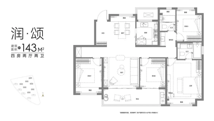143㎡四房:四开间朝南,南向面宽达13.8米,客厅与主卧均通阳台
