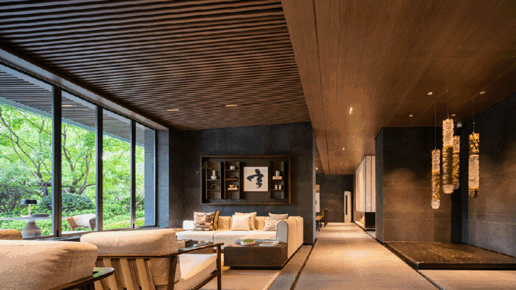 尚云赋的南侧主入口,重檐门庭、金属格栅、意趣昆石,搭配约70万珍稀古树,还原宋画中深宅大院的威仪。约57米恢弘尺度,媲美南京总统府门庭气度。东侧主入口,单是两株苍劲黑松,价值就达百万。其门头投入之重,可以想见。
