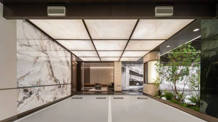 在光厅区域,设计团队顶面采用透光云石,经过反复的透光率测试,最终呈现月光般柔和的漫反射效果;两侧柱体精选天然奢石,其天然纹理在定向光源的映照下,形成独特的光影叙事。这种设计既避免了过度装饰,又让空间在光影流转中自然流露出温润气质。