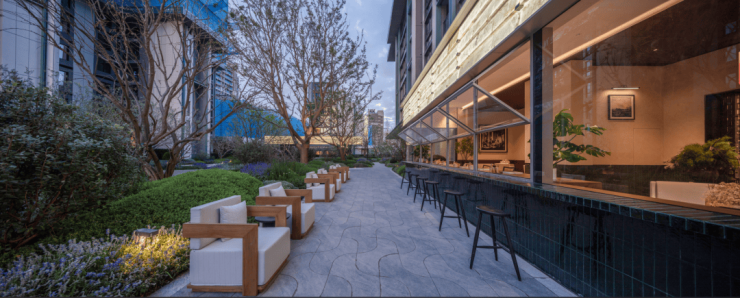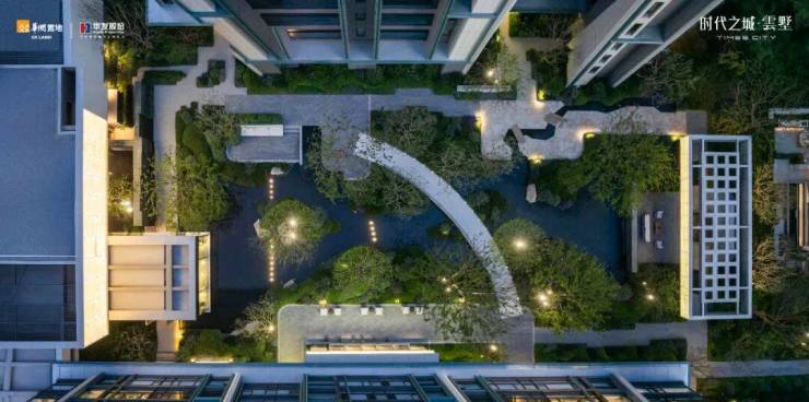 “一轴三带五园”园林:中央绿谷、童梦乐园、长者花园、林荫跑道、静谧花境,移植胸径20cm以上乔木,四季有景。