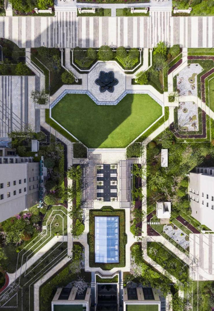 特色:结合广场、草坪、水景,提供多样主题空间