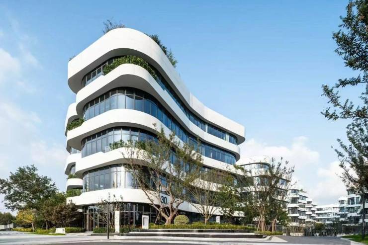 外立面采用包豪斯湾流曲线设计,螺旋上升立体绿篱+屋顶花园实景呈现