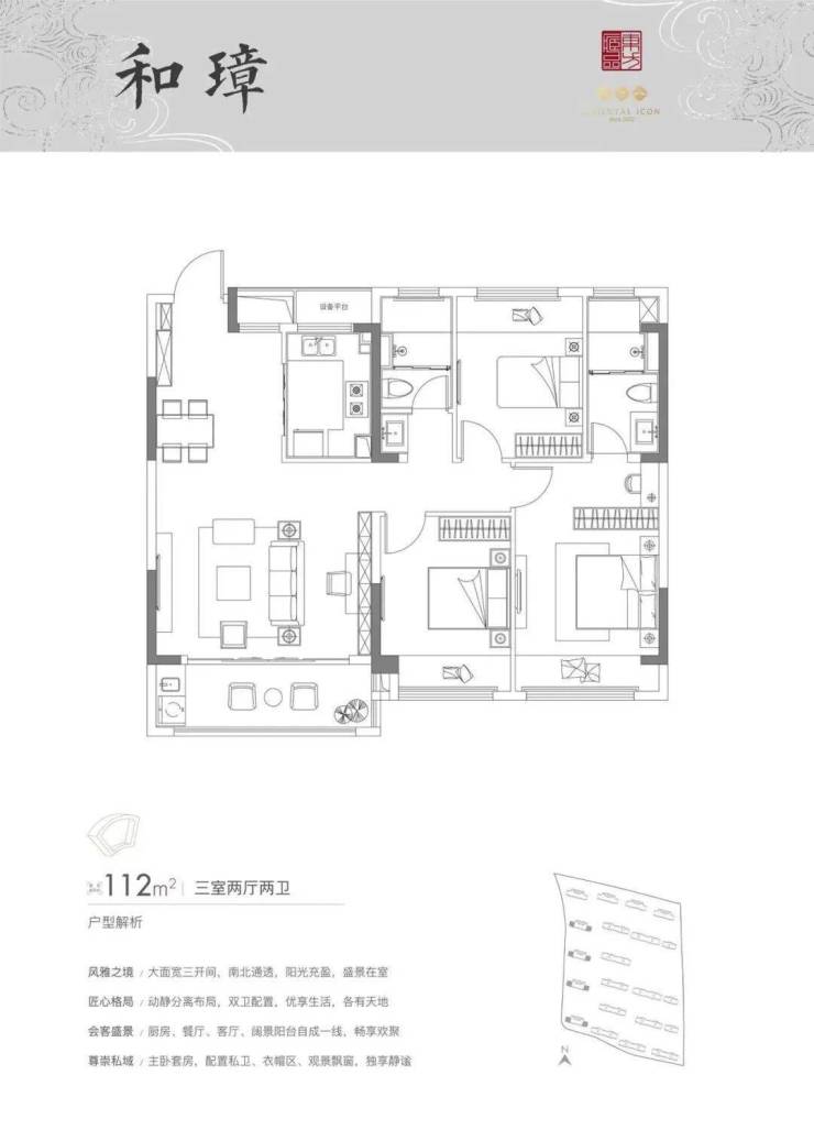 112㎡ 三室两厅两卫,这个户型很棒,面积放大之后,各空间的尺度也上去了,开间5米的竖厅不用再摆餐桌,市面上同等面积做5.6-6米的横厅,这个竖厅会更舒服,而且还是边户。
