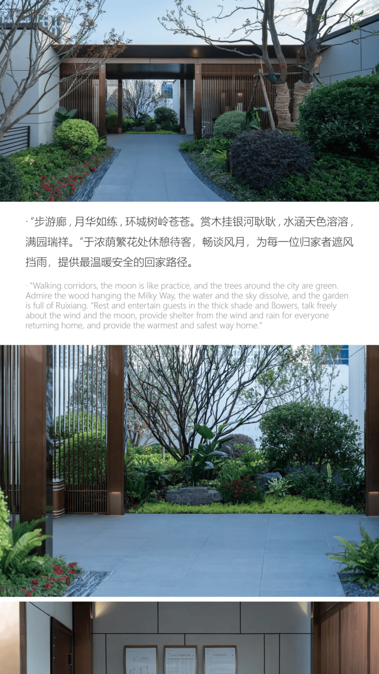 创新设计:打造昆山首个“堂客厅”住区,设置四重追光礼序园林(微光林栖、光影逐梦等),通过风雨连廊串联社区大堂与入户电梯,实现“无雨归家”,提升归家仪式感与私密性。