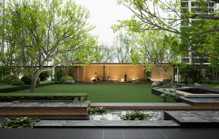 社区设计:悬浮飞檐、四重空间序列(门庭-庭院-厅堂-园景)