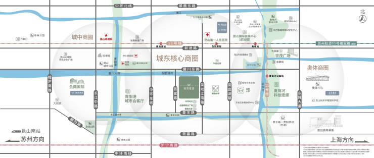 高速/快速路 :紧邻 娄东路、吴淞江路、中环东线、前进东路 ,自驾至昆山市中心15分钟,至上海虹桥50分钟。
