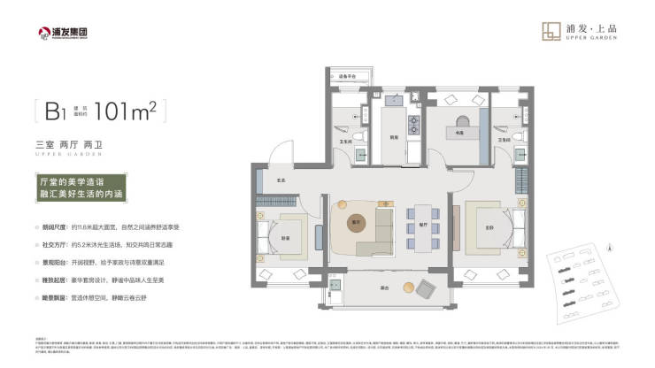 101㎡三房:南向三开间设计,主卧套房带独立卫浴,客卫干湿分离,U型厨房设计
