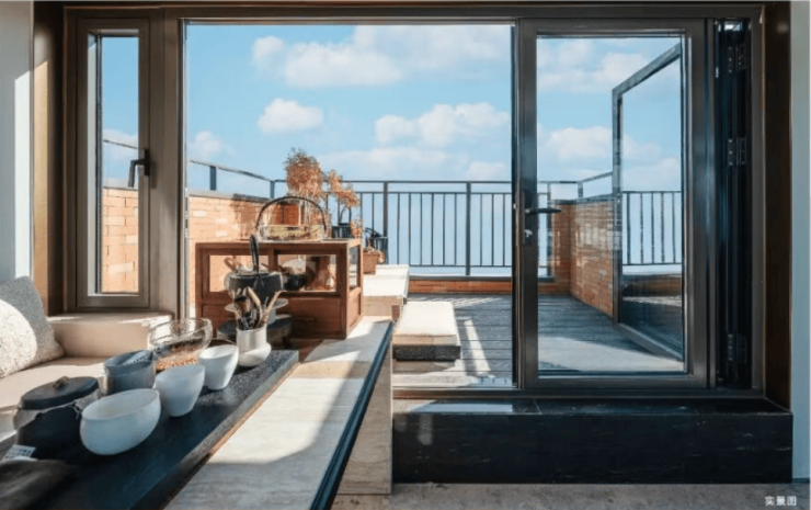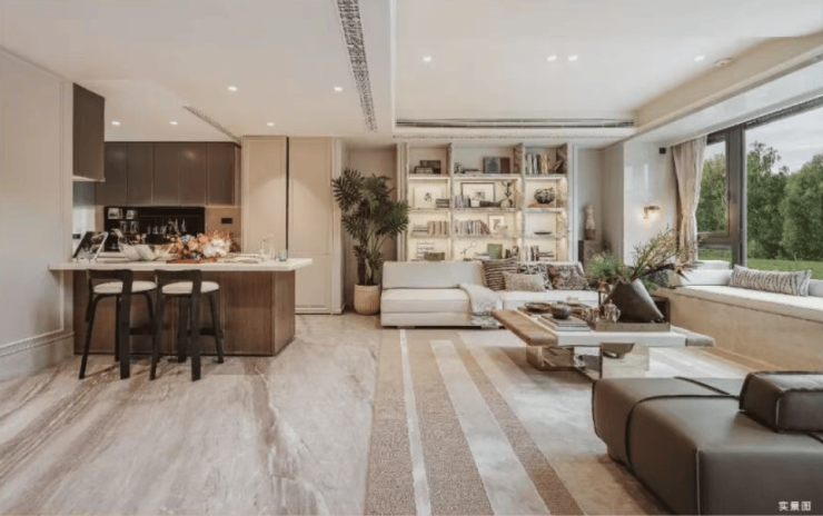 客餐厅、南向次卧、独立主卧层层配享同等尺度面宽,充分将全天日照最大限度地纳入室内。巨幅落地玻璃窗如同取景框,将庭院绿意无缝衔接入内,最大化确保了每位家庭成员都能平等地享有阳光与观景的权利。