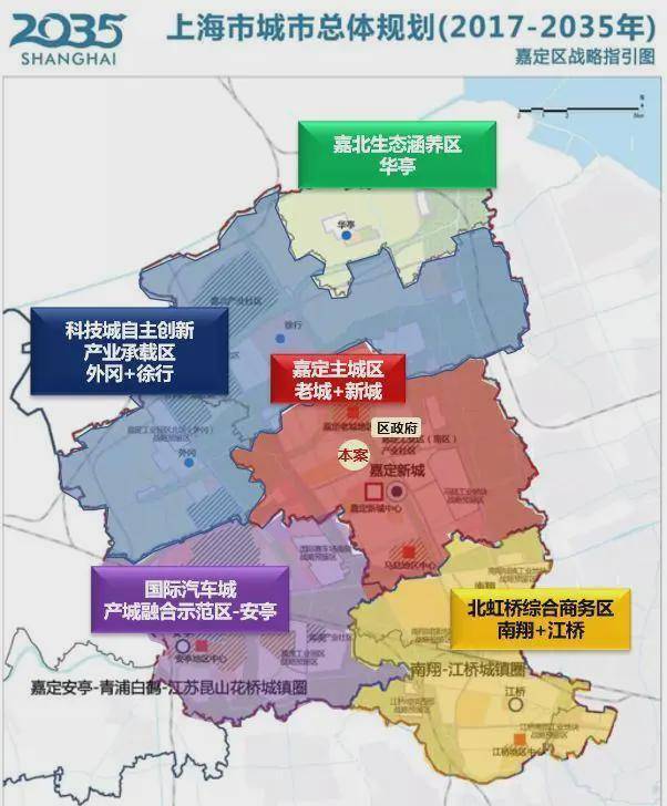 嘉定规划形成“一核四区”功能布局:嘉定主城区是核心,四区是指虹桥综合商务区(也就是南翔和江桥)、科技城自主创新产业承载区(徐行和外冈)、安亭国际汽车城产城融合示范区、华亭嘉北生态涵养区。