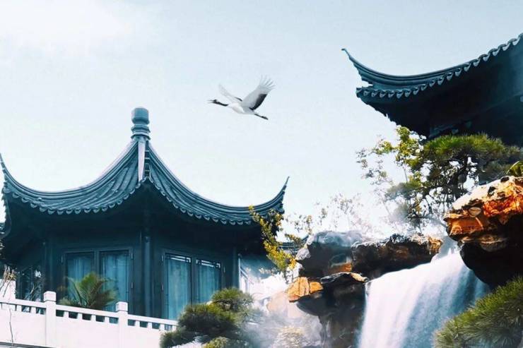 池中水面倒映着阁楼台榭的影子,仙鹤悠然,与水中天光云影虚实对应,颇有一番藏月入谷之情韵。