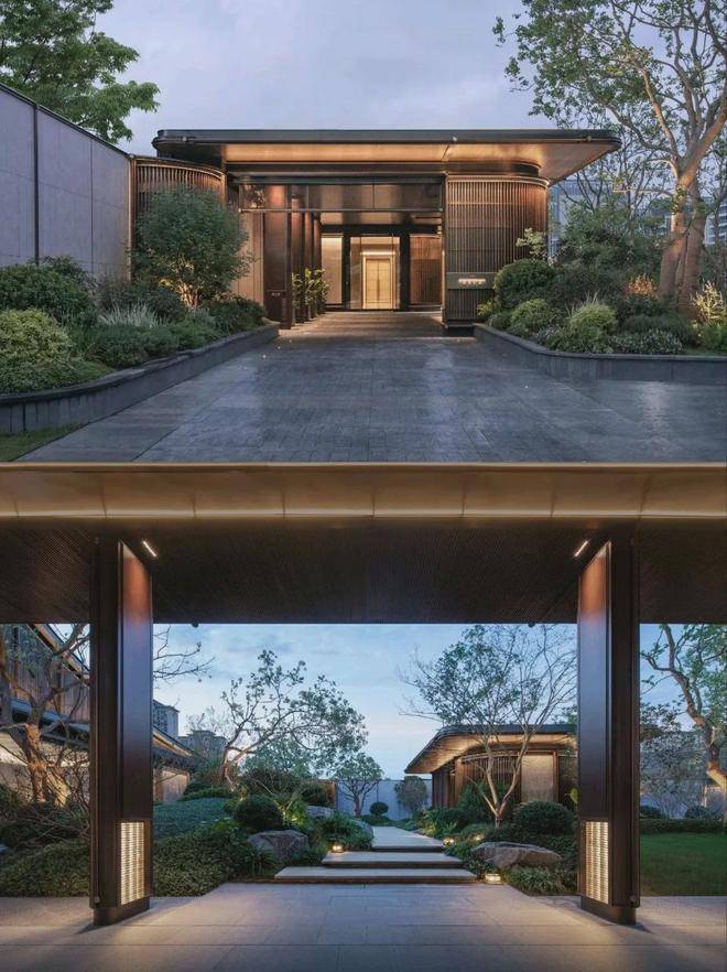项目采用新中式园林设计,外立面采用三面铝板搭配大面积玻璃窗,香槟金色调提升视觉质感。园林规划融合东方美学理念,采用"三进两轴十二园"布局,打造开放式景观空间,包含风雨连廊、水景庭院等特色元素。
