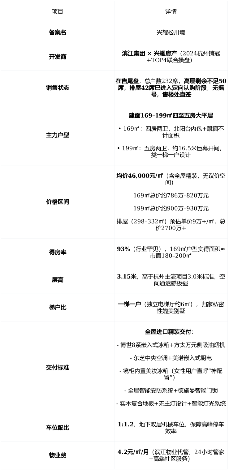兴耀松川境不是普通豪宅,而是 杭州奥体南板块唯一容积率低于2.0的纯改善藏品 ——仅232席、190套高层+42席排屋, 滨江集团×兴耀房产联合操盘 , 单价4.6万/㎡含全屋进口精装 , 得房率高达93% ,实得面积直逼市面180–230㎡户型。