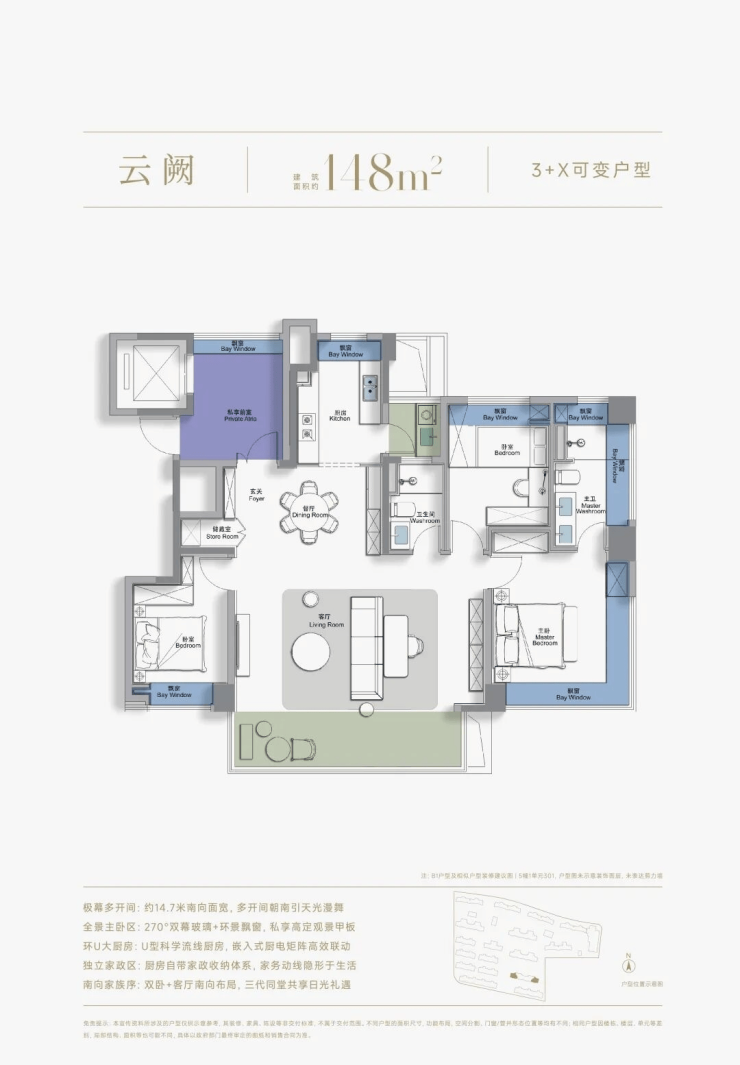 主力户型125–160㎡四房起步得房率约78%,全明格局,LDK一体化设计,主卧套房+独立衣帽间,双卫干湿分离,南向宽厅≥4.2米