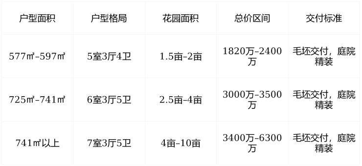 741户型,占地3亩到10亩之间,售价:3700万—6300万