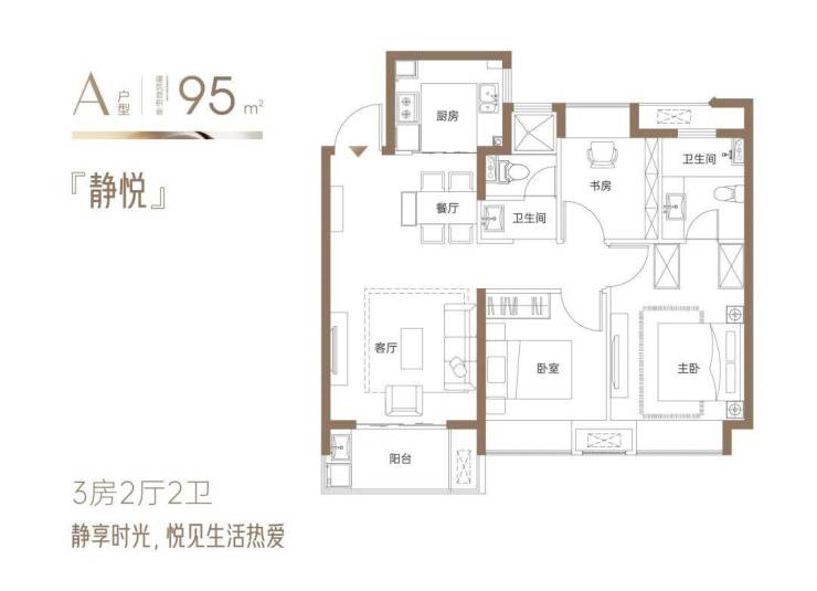 『静悦』约95㎡3房2厅2卫:三开间向阳户型,面朝风景,沐浴阳光;全明通透,让阳光照进每一寸惬意生活;户户飘窗,逐光而居,延伸空间尺度;全明卫设计,赋予私密空间明亮与清新;。方正有序的空间艺术,舒适实用,张弛有度