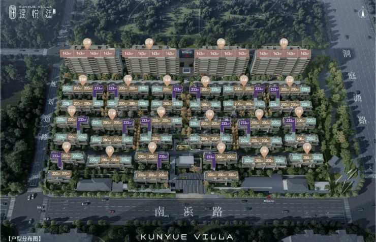 琨悦廷打造仅有289户的纯粹高端低密社区。南侧为115席建面约200㎡、220㎡、233㎡联排别墅;北侧为4栋总高11F,建面约143㎡洋房,仅此174席。