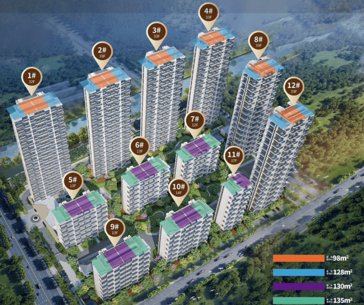 12栋四代住宅,包括6幢32-33F高层,6幢12-17F小高层