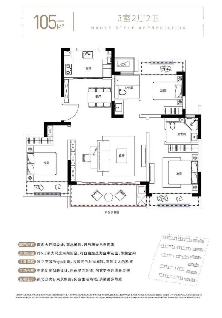 空间特色:得房率84%-87%(部分户型实际使用面积相当于高层110㎡),南北通透+双联阳台设计,地下室可拓展