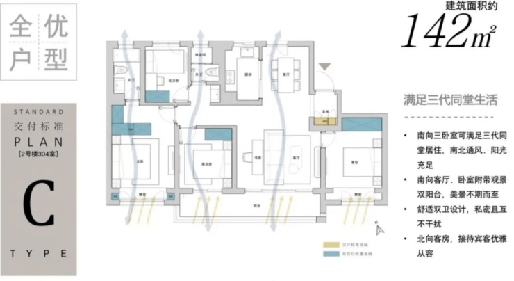 主力户型:111㎡三居、131-142㎡四居,全明设计,双阳台,主卧朝南
