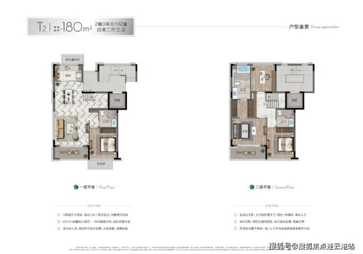 下叠主力户型约180㎡四房三卫,大面积落地玻璃,户型窗墙比超60%,通透敞亮;每户均带南向庭院(约50-60㎡,部分可达100㎡),并创意性做了地下空间。