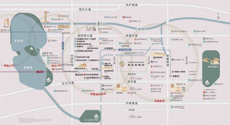 交通配套:项目紧邻金鸡湖大道、东方大道等主干道,距离规划中的地铁6号线延伸线长虹路站约400米,周边还有沪常高速、常嘉高速双高速贯通,30min可达园区CBD,高铁规划包括通苏嘉甬铁路、苏锡常城际铁路等未来将提升区域连通性