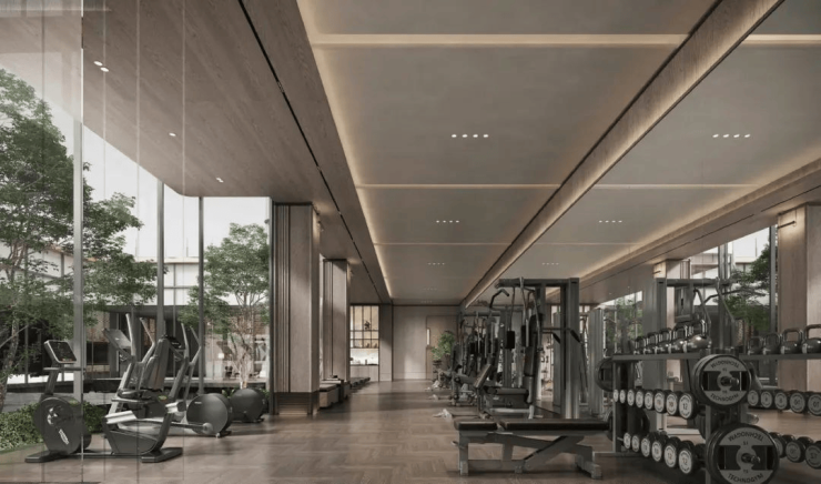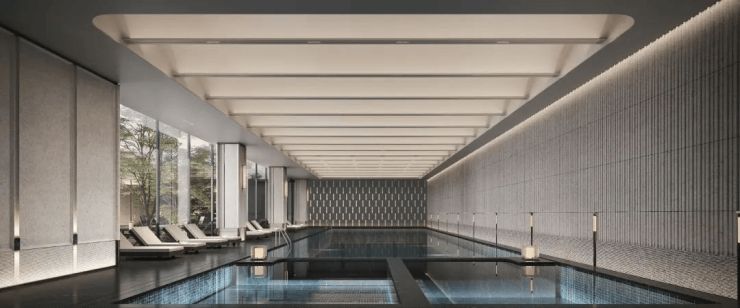 约1300m²高奢观瀑泳池会所:将轻氧健身、律动瑜伽、恒温泳池、沉浸书吧、高奢会客等功能区进行配置,全力打造圈层社交的专属私域。
