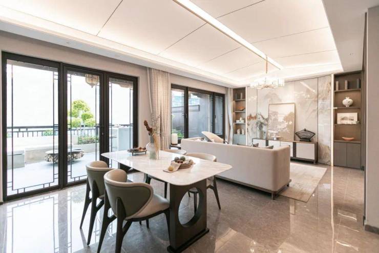 新品中式叠院在成熟工艺的基础上,深度结合江南文化、吴越文化与海派文化,从古代经典建筑元素中,汲取东方建筑形制,再现名仕礼序与当代中国生活意境。同时采用逐层退台的设计,将叠院的阳台和露台面积扩展到最大,可谓“层层是花园,户户有园林”。