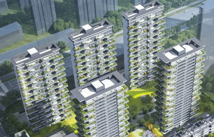 高层采用奇偶错层布局,奇数层南向、偶数层北向设置空中庭院,实现垂直绿化;户型为4房2厅3卫,客餐厅一体化设计,装标≥2000元/㎡