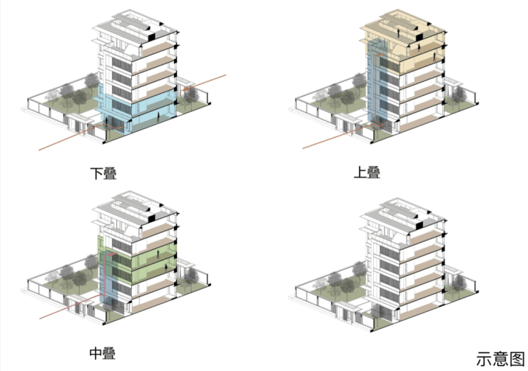 下叠:南北入户;中叠:北花园入户;上叠:单元门厅入户。