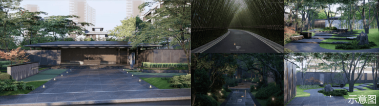 社区的景观设计布局,严格依照“一核二轴六巷”的设计理念进行展开。将阿丽拉酒店最典型的“风车结构”进行转译融入,提取了传统村落多巷道交汇的组团特征,建立起一个风车形网格系统,并延续了传统街巷,营造“玖重雅境”归家礼序中彰显尊崇归家仪式,构筑城芯隐居之所。