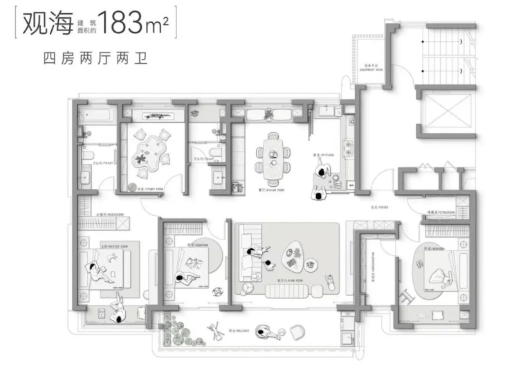 183㎡:4房2厅3卫,主卧套房+双主卧朝南,总价约795-987万。