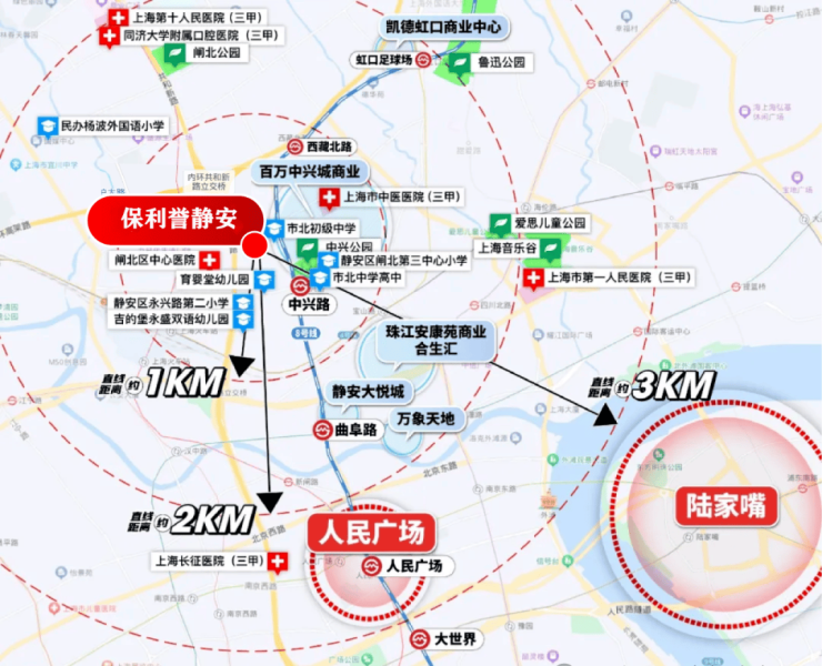 1公里范围内有静安大悦城、万象天地、凯德虹口商业中心、百万中兴城商业(在建中)、珠江安康苑的商业合生汇(在建中)等大型商场。