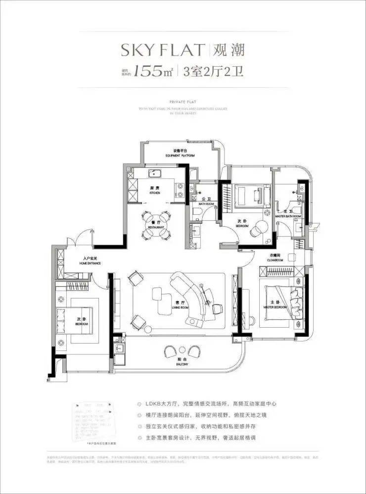 另外,该户型还为双套房设计,所有主卧、次卧均有独立卫浴。超大景观阳台连通客厅与卧室,使得无论哪个空间都能欣赏窗外的风景。