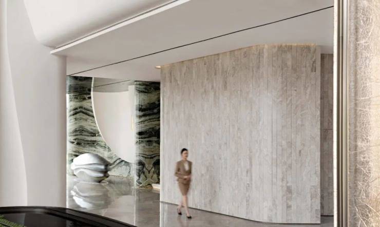 建筑提取黄金年代豪华公寓圆角形态母题,室内延续了风华时代的辉煌。透过金属的细节与几何元素在空间中的运用,探讨一场对城市格局与文化传承的思考,重塑人们的生活方式,营造建筑与自然共融新生的格局。